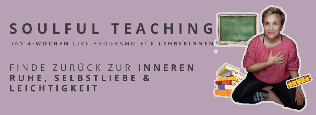„Soulful Teaching – Zurück zu mir“ ist mein Herzensprojekt für all die engagierten Lehrerinnen da draußen, die täglich so viel geben und einen so wertvollen Beitrag leisten und sich dabei oft selbst aus den Augen verlieren!! Mein ganzheitlicher Ansatz für mehr innere Ruhe und Kraft durch Coaching, Hypnose, Meditation, Breathwork und Yoga hilft dir dabei den Schulalltag mit seinen immer steigernden Herausforderungen nicht nur zu meistern, sondern wieder in deiner vollen Kraft und Leichtigkeit vor der Klasse zu stehen!